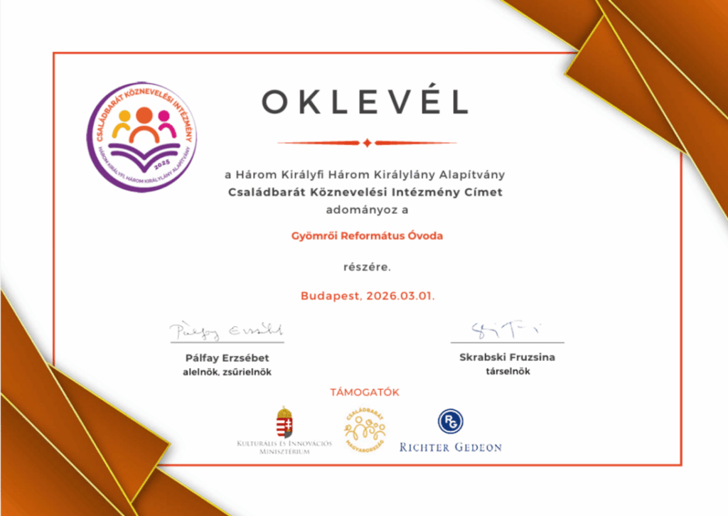 Elnyert címeinkCsaládbarát óvoda 2026.pompás mesés óvodacsaládbarát óvodaBolgár Zsuzsanna – Makkai Sándor-díjLegendi Katalin – Városi pedagógus-díj